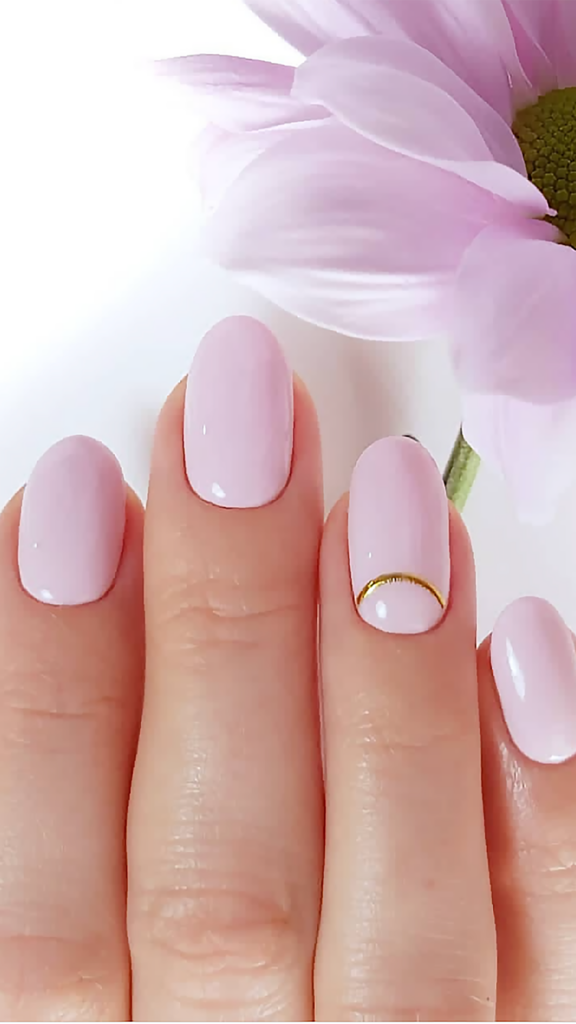A soft blush manicure with a delicate gold arc on one nail, adding a subtle hint of luxury. This look is minimalist yet elegant, ideal for those who appreciate understated beauty.