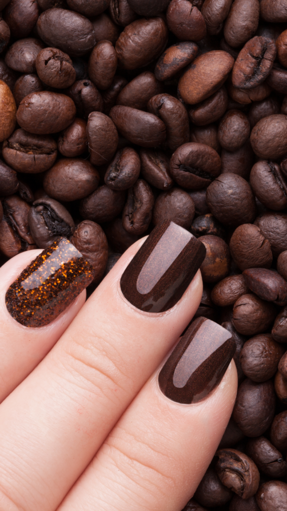 Dark coffee-colored nails with a touch of shimmer bring warmth and richness. One accent nail adds sparkle with brown glitter, perfect for cozy winter days and coffee lovers alike.