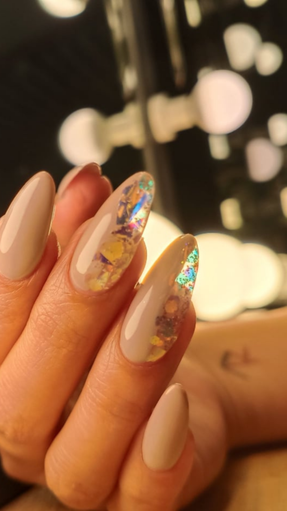 These nude almond nails keep it classic, with two accent nails decorated with colorful foil flakes. The look combines minimalism with a hint of artistic flair, great for a unique winter style.