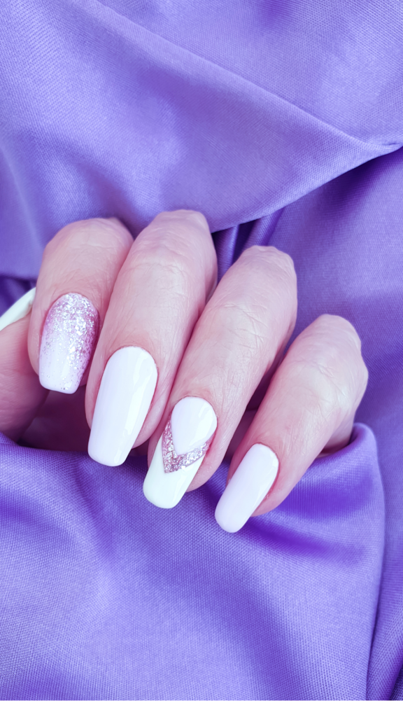 A soft white manicure with a playful twist – one nail has a pink glitter chevron, while another has a gradient glitter effect. This design is simple yet festive, with just the right amount of sparkle.