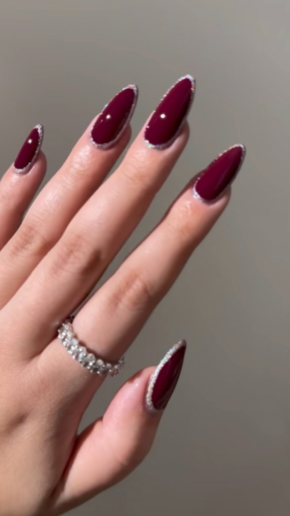 These deep burgundy nails are outlined with fine glitter, creating a luxurious and elegant look. Perfect for holiday parties or any occasion where you want a touch of sophistication.