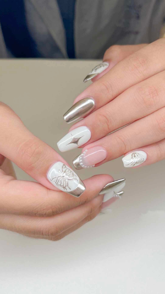 A mix of metallic and white nails with intricate designs, including butterflies and stars. This look combines elegance with a touch of whimsy, making it perfect for a festive occasion.