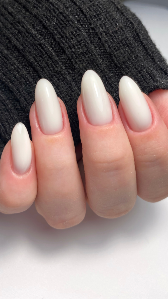 A simple yet chic frosted white manicure. The soft, snowy finish is ideal for anyone looking for a minimalist winter nail look that’s clean and sophisticated.