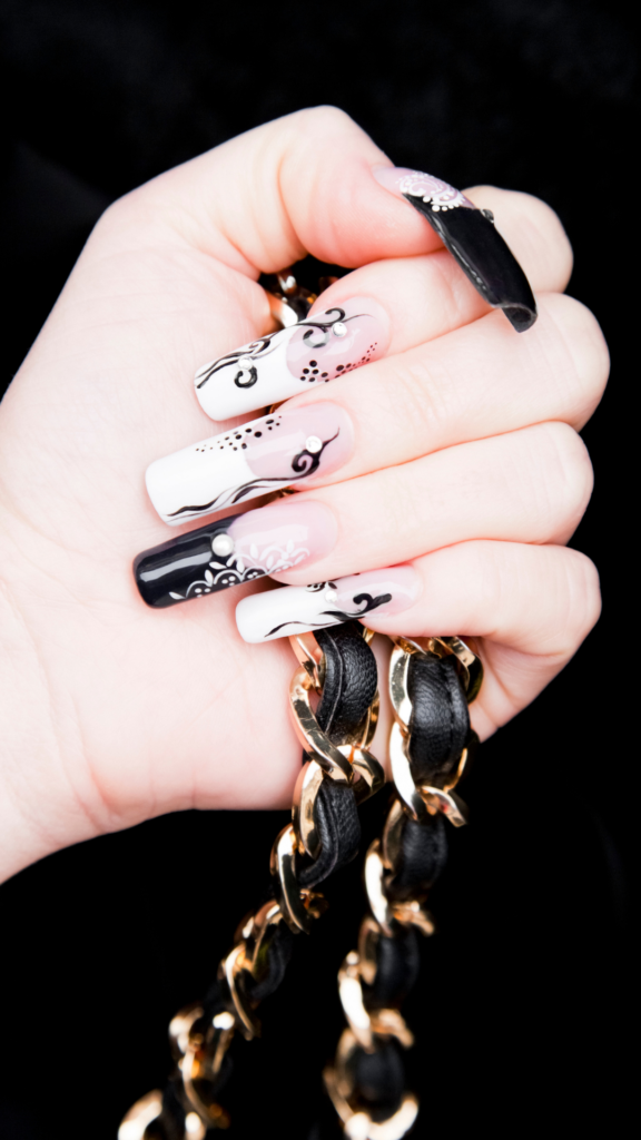 This design combines black and white with intricate patterns, giving each nail a unique touch. Rhinestones add a bit of sparkle, making this look bold and sophisticated.