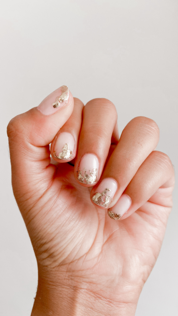 Natural nails with delicate gold foil accents create a subtle yet luxurious style. The look is understated and classy, ideal for those who prefer minimalist elegance.