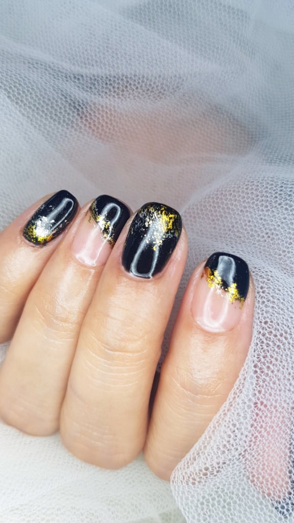 A mix of glossy black nails and gold foil accents creates a dramatic, high-contrast look. Some nails feature just a touch of gold at the cuticle, adding a chic, modern twist.