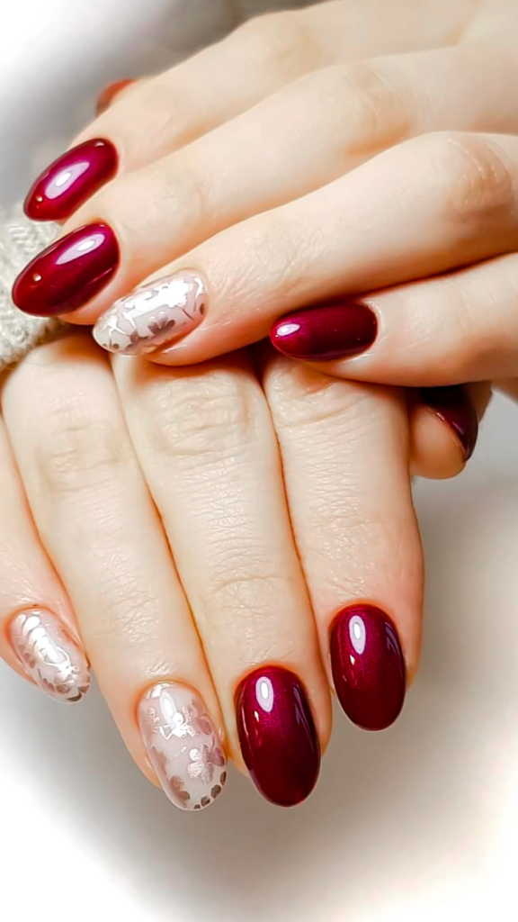 A rich, festive look with deep red, glossy nails. Two accent nails are decorated with delicate silver patterns, adding a subtle holiday touch without overpowering the classic vibe.