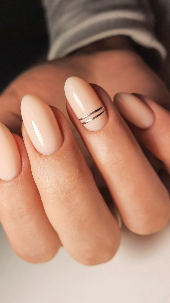 A chic nude manicure with a minimalist twist, featuring a single silver line on one nail. This look is modern, clean, and effortlessly stylish.