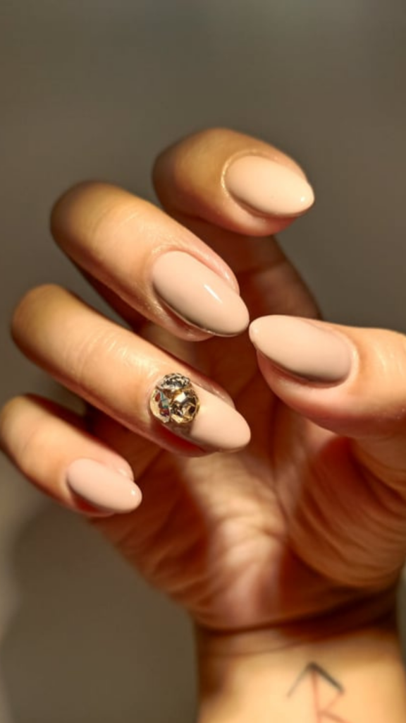 Neutral and chic, this nude manicure keeps it simple with one accent nail featuring a small cluster of gold and silver rhinestones. Ideal for a minimalist winter look with a hint of elegance.