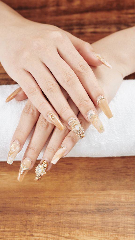 A luxurious look with a golden, marbled effect on long nails, decorated with intricate gem clusters. This design gives off an opulent vibe, perfect for a winter celebration with a touch of glam.