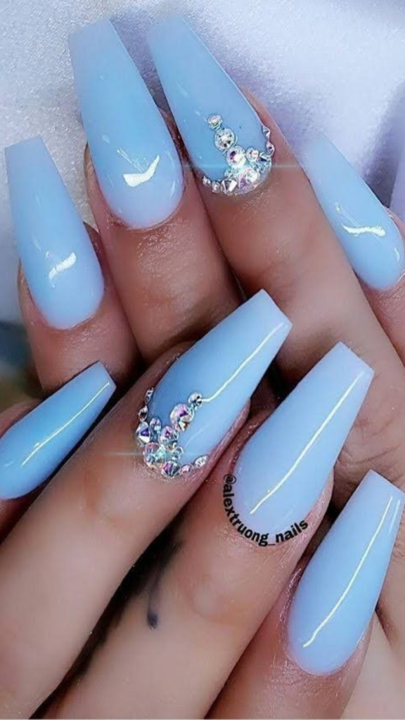 These soft blue nails create a frosty, wintry effect with their glossy finish. Rhinestone clusters on a few nails add sparkle, making this a chic and cool design for the season.