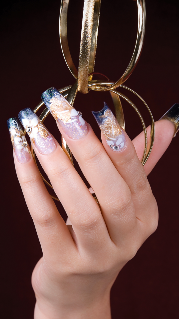 These nails feature a dark, gradient effect with gold leaf details and floral patterns, bringing a dramatic yet refined feel. Perfect for a night out or New Year’s Eve celebration.