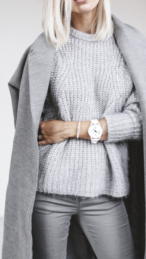 A cozy monochrome look featuring a chunky knit sweater layered with a soft, oversized coat in matching gray tones. The textured sweater and smooth coat create a balanced, stylish look, finished with a white watch and delicate bracelet for a touch of polish.