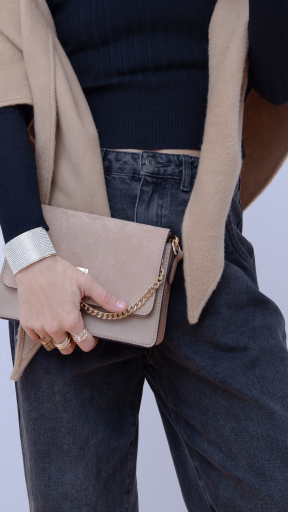 A chic black ribbed top paired with high-waisted dark jeans, layered with a camel-toned wrap. Accessories include a tan suede clutch with gold chain detailing and statement rings, adding a hint of glam to this understated winter look.