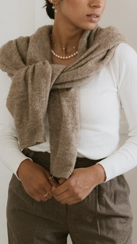 A classic, minimal ensemble with a white long-sleeve top and brown trousers. A neutral-toned sweater is casually draped over the shoulders, with layered pearl and star jewelry adding a feminine, elegant touch.