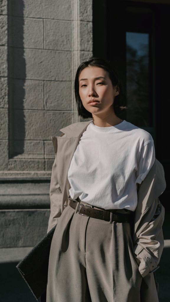Effortless style with a relaxed fit white t-shirt tucked into high-waisted beige trousers. A lightweight trench coat drapes over the shoulders, giving a laid-back yet polished vibe, complemented by a dark leather belt.