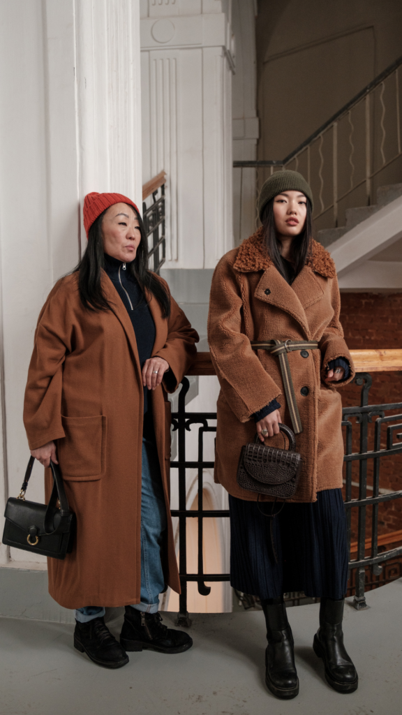 Two stylish layered looks in warm earth tones. One person wears a brown coat with a red beanie, while the other opts for a cozy belted teddy coat and green beanie. Both looks are finished with chunky black boots and structured bags.